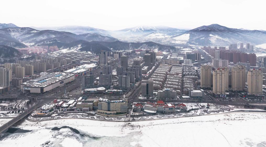 吉林省通化市城區(qū)和遠處的萬峰通化滑雪度假區(qū)(無人機照片)。新華社記者 許暢 攝