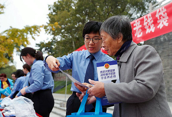 2023年10月22日,江蘇省興化市人民檢察院法治宣講團(tuán)的工作人員在公園向老年人講解反詐騙知識。新華社發(fā)(周社根攝)