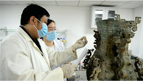 此外,為了堅(jiān)持“最小干預(yù)”原則,保證文物真實(shí)性,此次修復(fù)并沒有對(duì)蓮鶴方壺進(jìn)行統(tǒng)一著色。“我們著重清理了有害銹,而記錄著文物信息的無(wú)害銹得到原汁原味保留,紅斑處留紅,綠銹處存綠,保留文物的歷史信息。”杜安說(shuō)。
