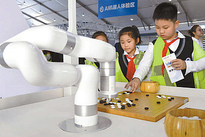 安徽合肥市蜀山區(qū)合肥體育中心,孩子們?cè)诤虯I機(jī)器人對(duì)弈。陳三虎攝