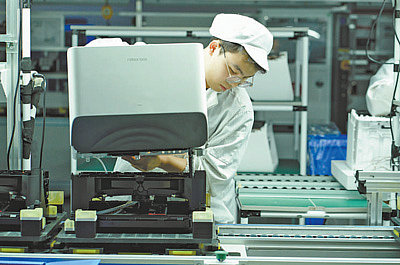 在石頭科技公司廣東惠州工廠,工人組裝掃地機(jī)器人。張寶座攝