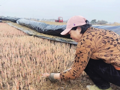 在塔水鎮(zhèn)玉池村,村民將黃土地里的薄膜掀開,利落地用鐮刀收割折耳根嫩芽,收割聲清脆悅耳。這些被收割下來的新鮮折耳根,經(jīng)過集中捆扎、清洗、裝袋后將被銷往重慶、成都、漢中等地。