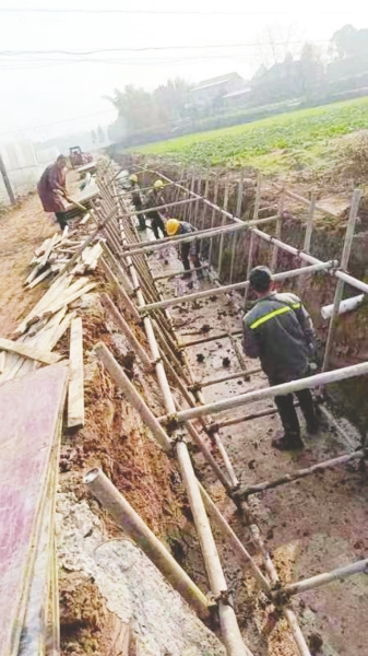 工人正在進(jìn)行排洪溝渠修建工作