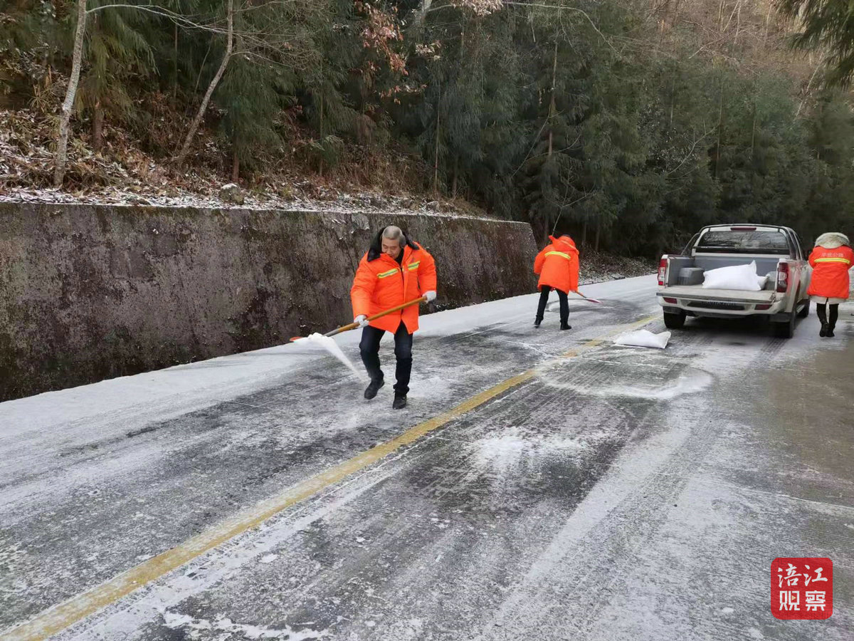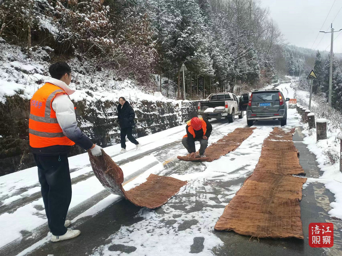 1月24日上午,在北川都貫-開坪公路上,公路養(yǎng)護人員為道路危險易滑路段撒融雪劑、鋪設防滑棕墊、設置交通標志牌,與交警一同勸返車輛。