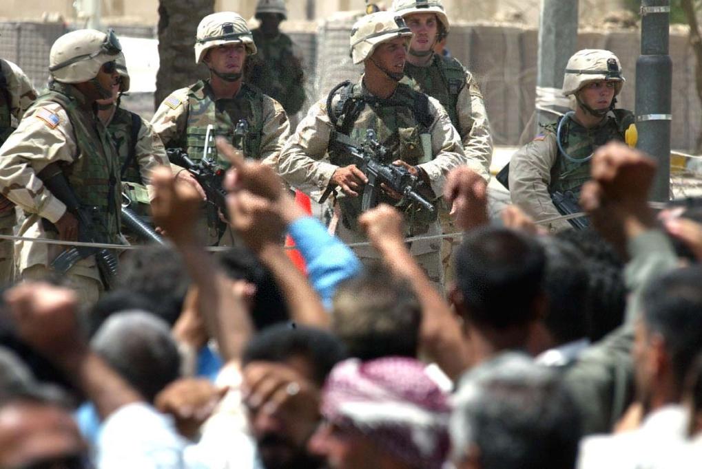 這是2003年6月18日,美軍士兵在伊拉克首都巴格達(dá)美英聯(lián)軍臨時(shí)總部門前持槍面對數(shù)百名示威的伊拉克人。新華社記者 趙建偉 攝