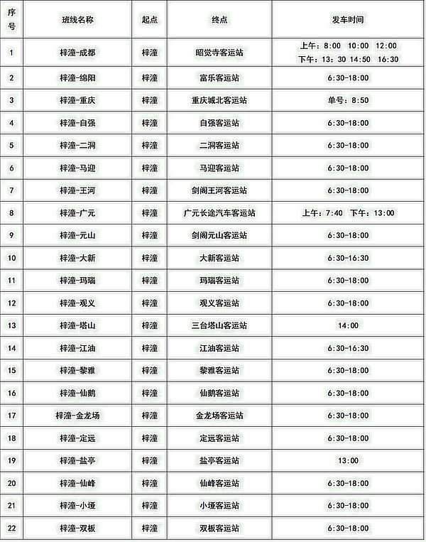 綿陽(yáng)城區(qū)各車(chē)站班次時(shí)刻表