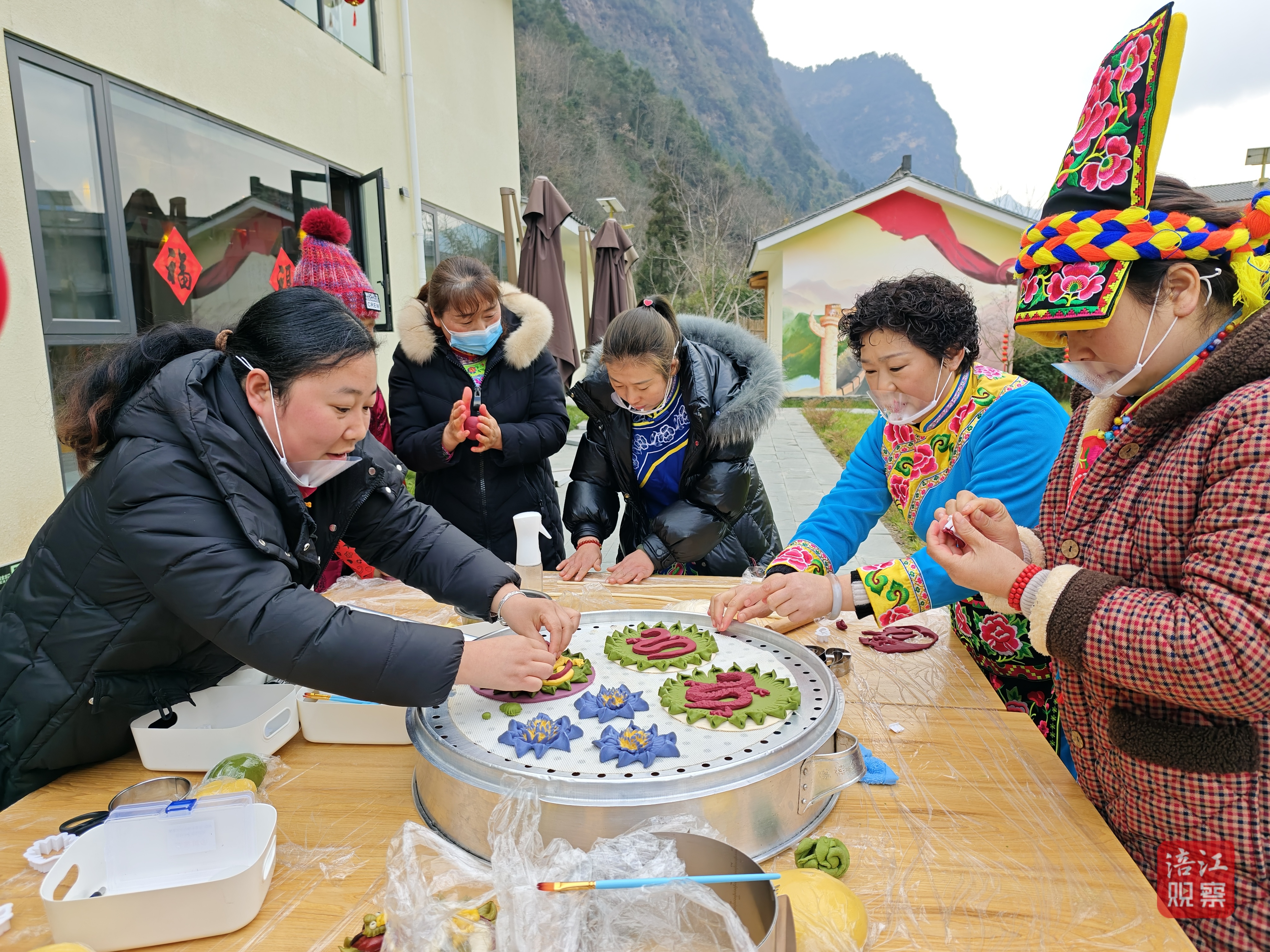 在北川,北川婦聯(lián)、陳家壩鎮(zhèn)黨委政府聯(lián)合開展“羌族鄉(xiāng)村過年味 花樣美食迎龍年”返鄉(xiāng)女性農(nóng)民工關(guān)愛慰問活動,30多名返鄉(xiāng)婦女身穿羌服,一起制作“龍”元素花饃,迎接龍年新春的到來。