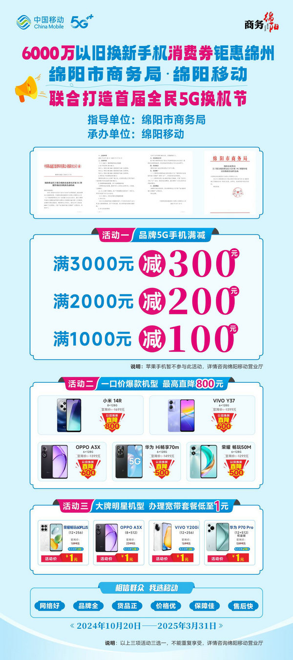凡到綿陽移動營業(yè)廳購買5G手機,直降100-300元。