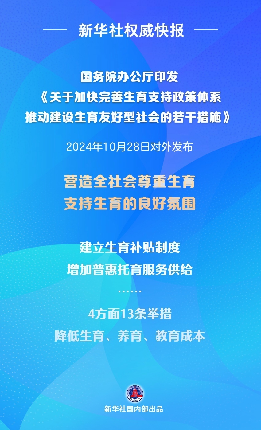 國(guó)務(wù)院辦公廳印發(fā)的《關(guān)于加快完善生育支持政策體系推動(dòng)建設(shè)生育友好型社會(huì)的若干措施》2024年10月28日對(duì)外發(fā)布。