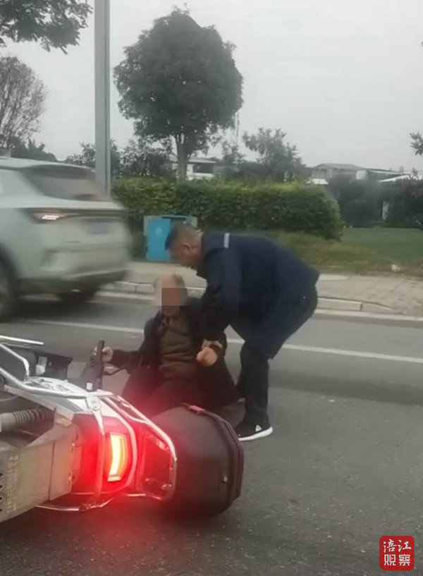 隨后,車詩坤將老人的電瓶車扶起,此時另一名男子也趕來幫忙,兩人合力將車輛推到路邊。