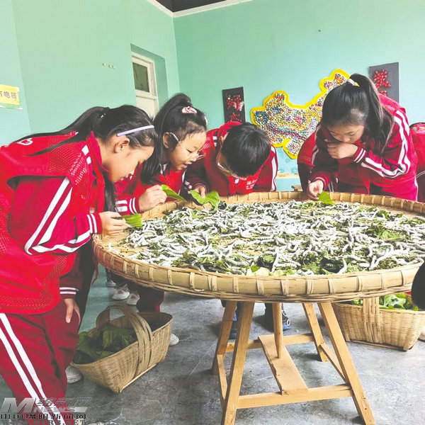 孩子們在研學(xué)活動中體驗(yàn)喂蠶