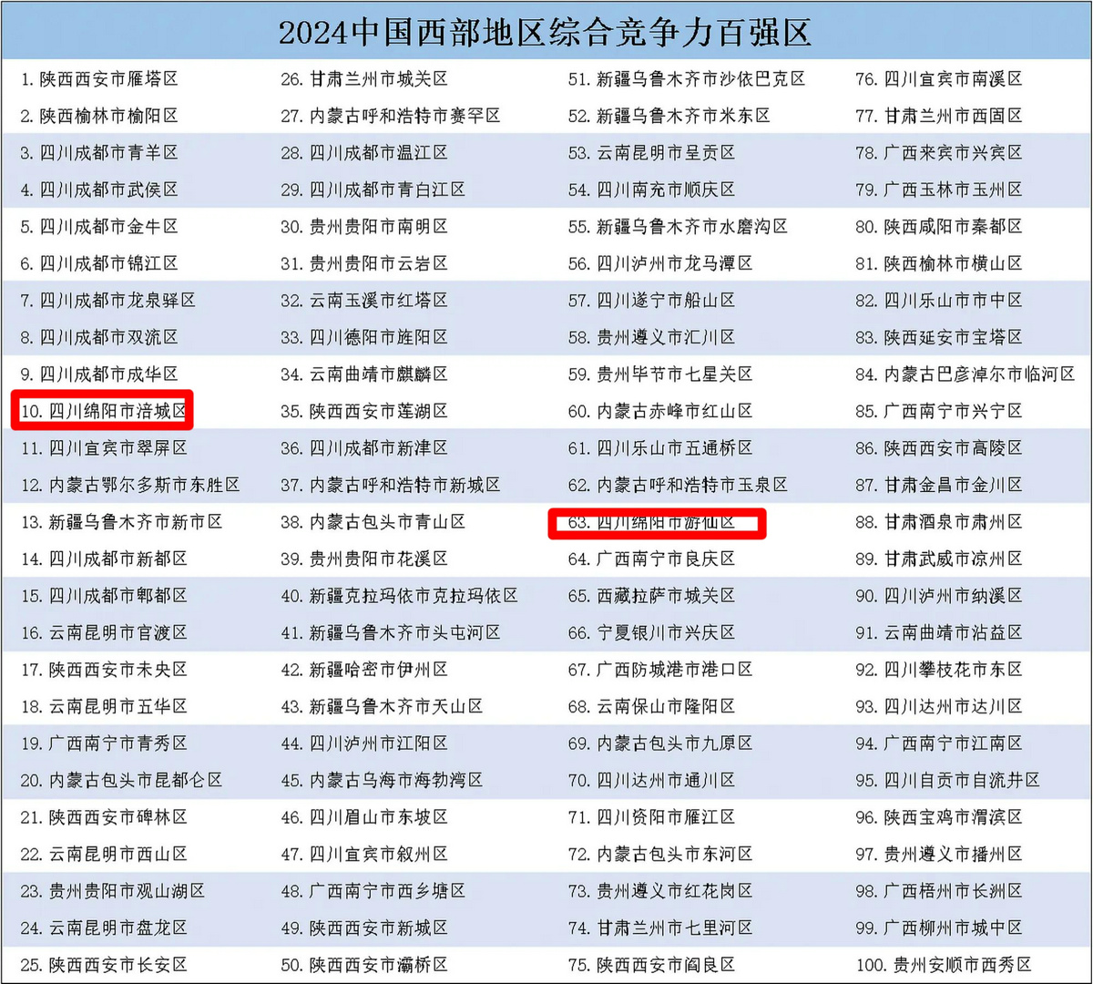 在2024中國西部地區(qū)綜合競爭力百強區(qū)榜單中,綿陽市涪城區(qū)位列第10名,游仙區(qū)位列第63名;在2024中國西部地區(qū)綜合競爭力百強縣市榜單中,江油市位列第20名,三臺縣位列第58名。