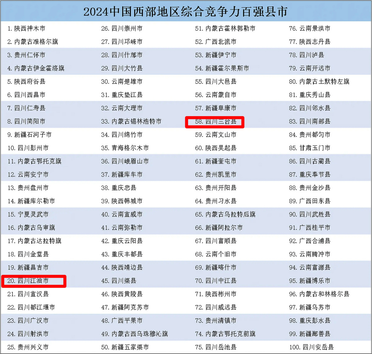 近日,競爭力智庫、北京中新城市規(guī)劃設計研究院等機構在北京發(fā)布《中國西部地區(qū)縣域發(fā)展監(jiān)測報告2024》(簡稱《報告》),揭曉2024中國西部地區(qū)綜合競爭力百強區(qū)、2024中國西部地區(qū)綜合競爭力百強縣市名單。綿陽市涪城區(qū)、游仙區(qū)、江油市和三臺縣榜上有名。