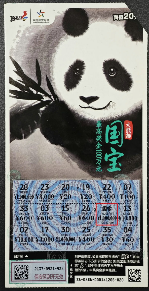 位于綿陽涪城區(qū)永惠路北段51號的5107021577門店,在近期中出頂呱刮“國寶”頭獎。當天,一位身穿紅衣的購彩者在柜臺觀察后,選擇了票面描繪著神態(tài)栩栩如生的“國寶”即開票。隨著一個國寶標志被刮出,紅衣小哥發(fā)出“咦”的一聲驚嘆,低頭仔細的數(shù)起了位數(shù):“個、十、百、千、萬、十萬,一百萬??!”旁邊購彩者不敢相信的湊了過來,一起觀察起這張百萬獎票,購彩者也開心的拿出手機拍下了中獎瞬間,記錄自己見證大獎誕生的時刻。
