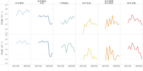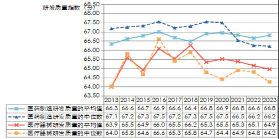 過(guò)去十一年間,中國(guó)醫(yī)藥企業(yè)研發(fā)質(zhì)量指數(shù)總體呈波動(dòng)上升趨勢(shì),且行業(yè)領(lǐng)軍企業(yè)的研發(fā)質(zhì)量增速尤為亮眼,引領(lǐng)著整個(gè)行業(yè)研發(fā)質(zhì)量的進(jìn)步。具體來(lái)說(shuō),其平均值從2013年度的65.97分增長(zhǎng)至2023年度的66.25分,累計(jì)增長(zhǎng)了0.28分,增長(zhǎng)率為0.42%。這一積極增長(zhǎng)的態(tài)勢(shì)在醫(yī)藥制造和醫(yī)療器械兩大核心領(lǐng)域均有所體現(xiàn),其中,醫(yī)藥制造研發(fā)質(zhì)量指數(shù)的平均值從2013年度的66.33分增長(zhǎng)至2023年度的66.81分,累計(jì)增長(zhǎng)了0.48分,增長(zhǎng)率為0.72%;醫(yī)療器械的平均值從2013年度的63.99分增長(zhǎng)至2023年度的64.95分,累計(jì)增長(zhǎng)了0.96分,增長(zhǎng)率為1.50%。具體至細(xì)分行業(yè),醫(yī)療設(shè)備、化學(xué)制藥、生物制品以及醫(yī)療耗材這四個(gè)細(xì)分行業(yè)在研發(fā)質(zhì)量上均呈總體上升趨勢(shì),且醫(yī)療設(shè)備的研發(fā)質(zhì)量提升尤為顯著,其平均值從63.20分增長(zhǎng)至64.93分,增幅高達(dá)1.73分,增長(zhǎng)率為2.74%。然而,值得注意的是,中藥和體外診斷這兩個(gè)行業(yè)在研發(fā)質(zhì)量上卻呈現(xiàn)出下滑的趨勢(shì),中藥行業(yè)的平均值從66.52分下降至65.24分,體外診斷行業(yè)的平均值從65.23分微降至64.83分。