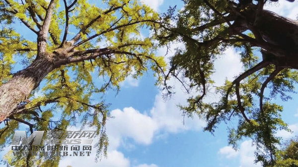 藍(lán)天之下,金黃銀杏葉熠熠生輝