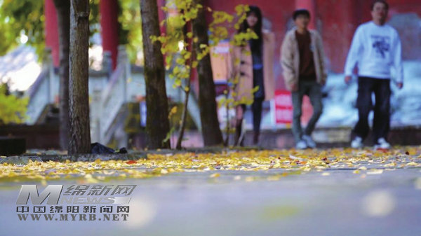 游人行走在鋪滿銀杏葉的路上