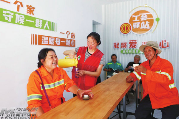 冷可取暖、熱可納涼、渴可喝水、累可歇腳。環(huán)衛(wèi)工人、綠化工人等在游仙區(qū)富樂(lè)街道工會(huì)驛站喝水、休息。(視覺(jué)綿陽(yáng)資料圖片)