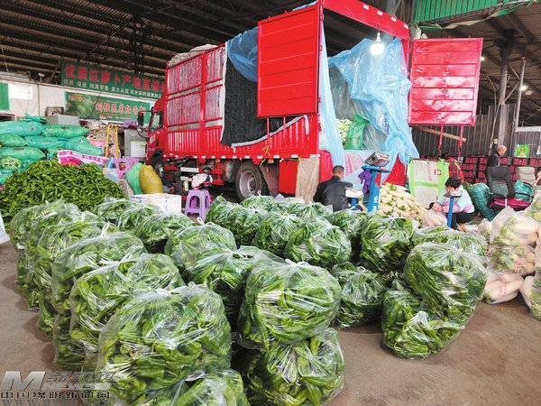 在高水批發(fā)市場(chǎng)里,滿載著各類蔬菜的貨車正在下貨。