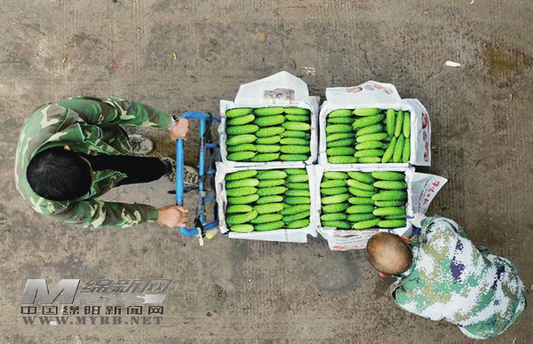 工人將黃瓜運(yùn)送至分揀區(qū)