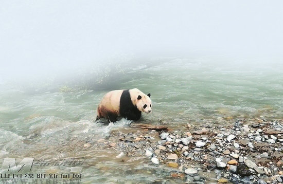 在大熊貓國(guó)家公園平武王朗片區(qū),一只大熊貓涉過(guò)小溪。