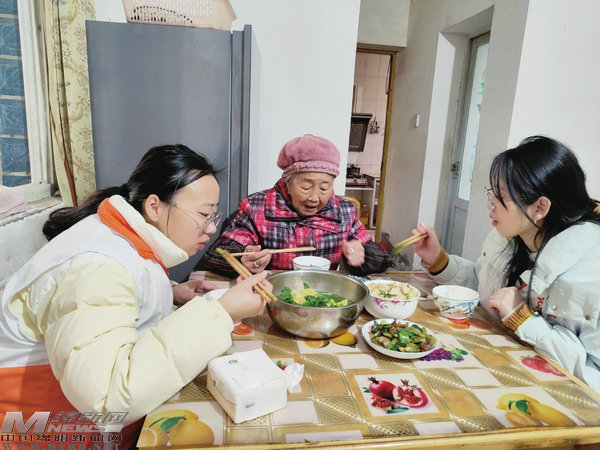 “開飯啰!”中午12點(diǎn),萵筍蒜苗炒肉、紅燒豆腐、雞蛋豌豆尖湯被端上桌,一桌家常菜美味而溫馨,三人陪著陳婆婆邊吃邊聊,餐后,收拾清洗好碗筷,將屋子收拾得井井有條。“這些孩子就像自己的‘兒女’一樣,幫我買菜、做飯,陪我拉家常,有他們的陪伴我感覺很幸福。”陳婆婆說。