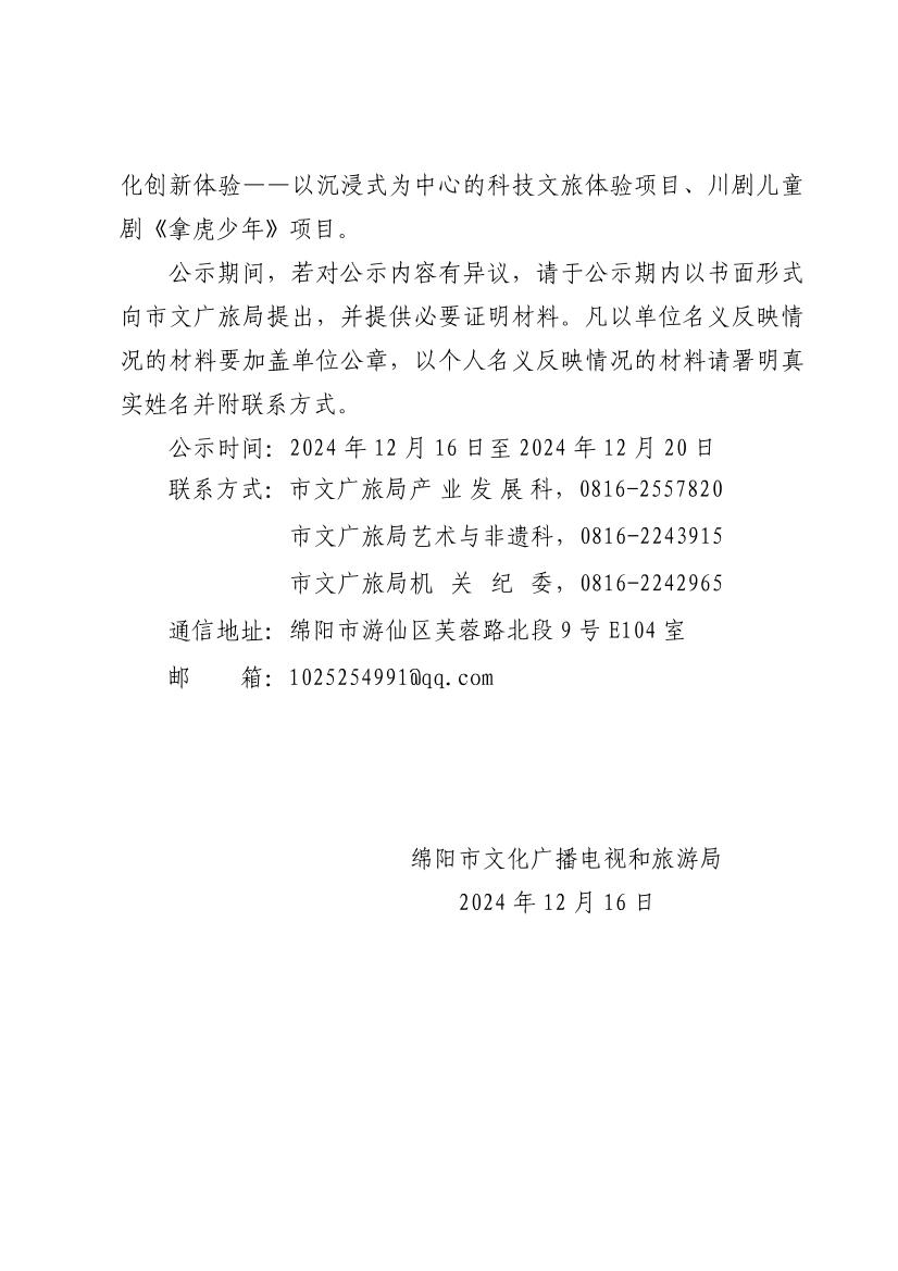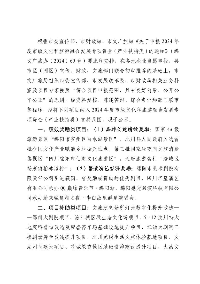 綿陽市文化廣播電視和旅游局 2024年市級文化和旅游融合發(fā)展專項資金(產業(yè)扶持類)擬支持項目名單公示