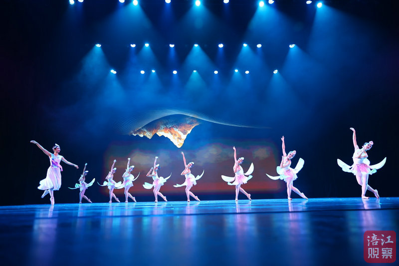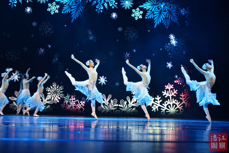 19時(shí)30分,如夢(mèng)似幻的雪花飄然而下,伴隨著悠揚(yáng)的音樂(lè),原創(chuàng)芭蕾音詩(shī)舞《涪鷗》正式拉開(kāi)演出序幕。