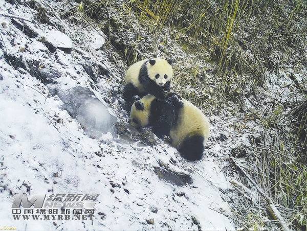 綿陽新聞網訊 近日,平武縣木座藏族鄉(xiāng)和平村巡護隊員在整理紅外相機拍到的素材時,發(fā)現了兩只野生大熊貓在雪地里活動的畫面。