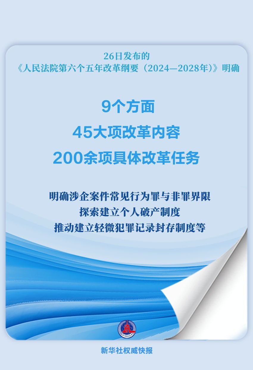 最高人民法院12月26日發(fā)布《人民法院第六個(gè)五年改革綱要(2024—2028年)》,科學(xué)系統(tǒng)謀劃未來(lái)一個(gè)時(shí)期人民法院司法改革工作,健全公正司法體制機(jī)制,加快建設(shè)公正高效權(quán)威的社會(huì)主義司法制度。