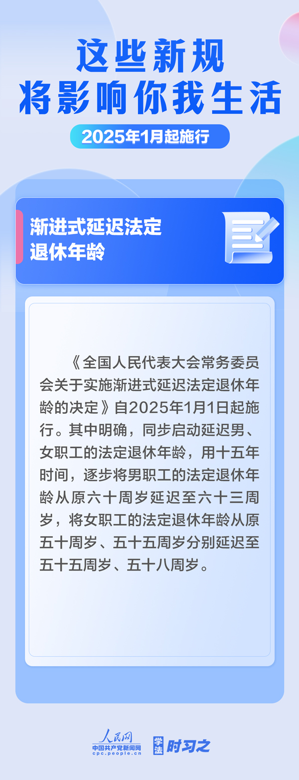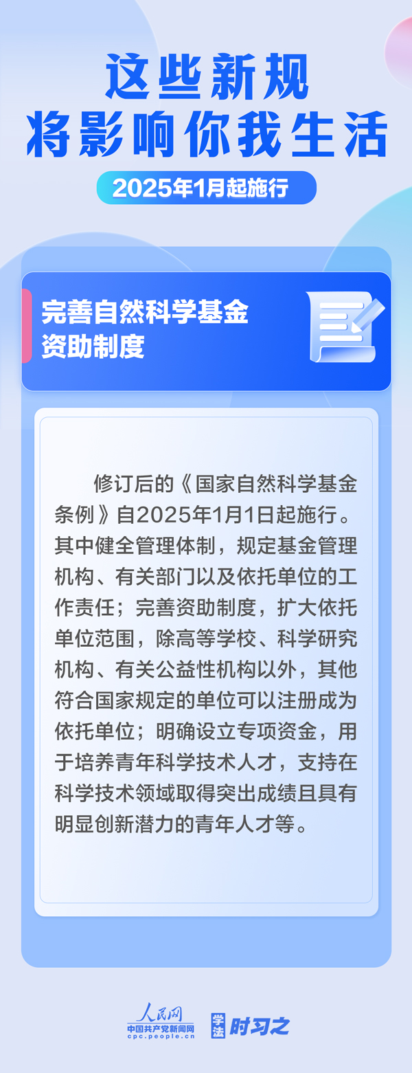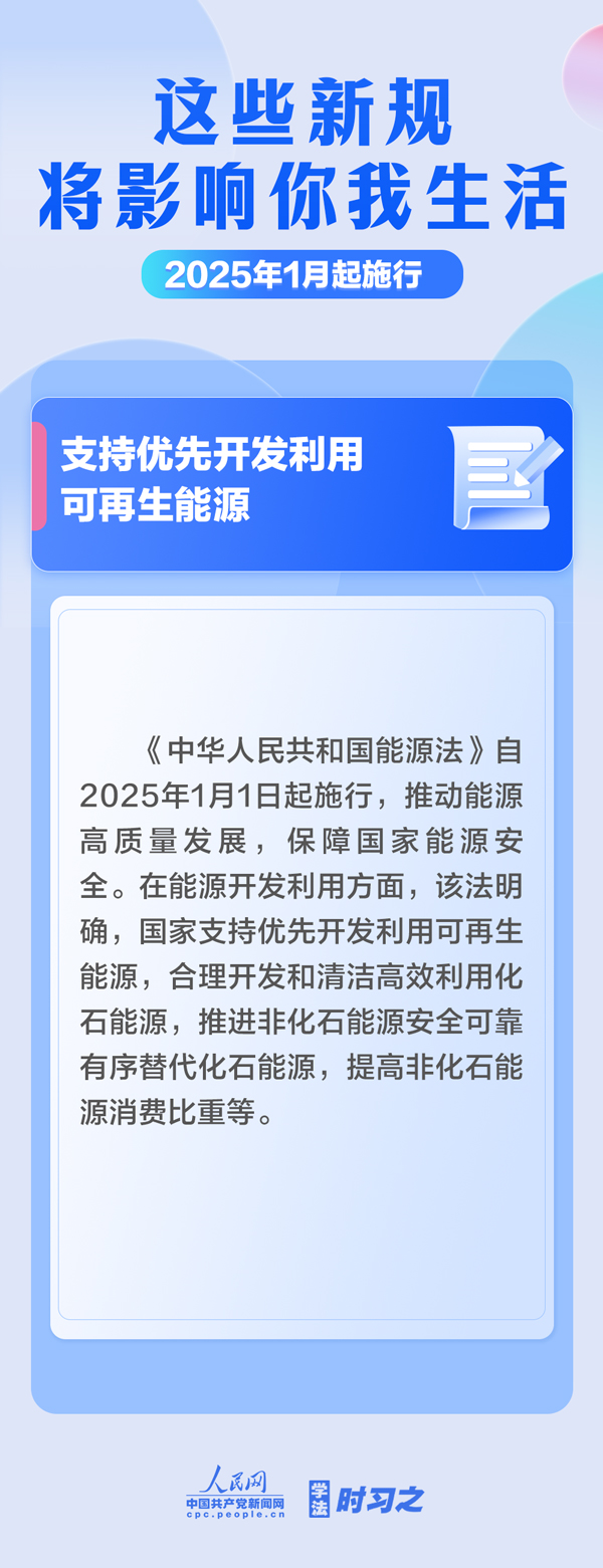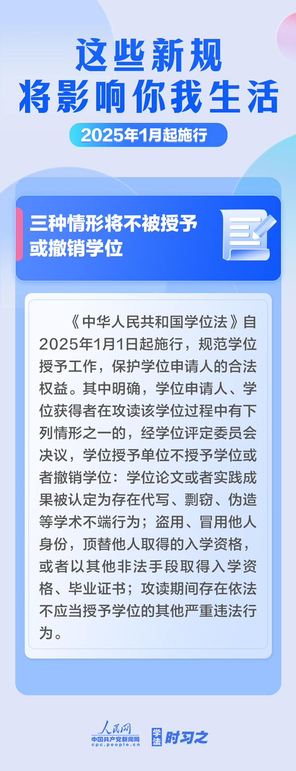 明確不授予學(xué)位或者撤銷學(xué)位的三種情形;支持優(yōu)先開發(fā)利用可再生能源;漸進(jìn)式延遲法定退休年齡;完善自然科學(xué)基金資助制度……2025年1月起,這些新規(guī)施行,將影響你我生活。
