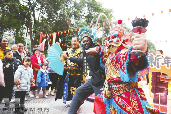 西南科技大學(xué)外籍師生在非遺市集體驗川劇變臉
