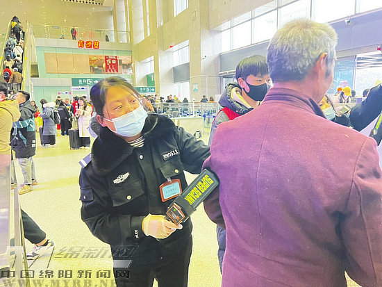 上午10時(shí)許,綿陽火車站檢票廳外,推著行李、背著大包的旅客排到了站門口外。記者隨著客流進(jìn)入車站,所有安檢通道均已開啟。