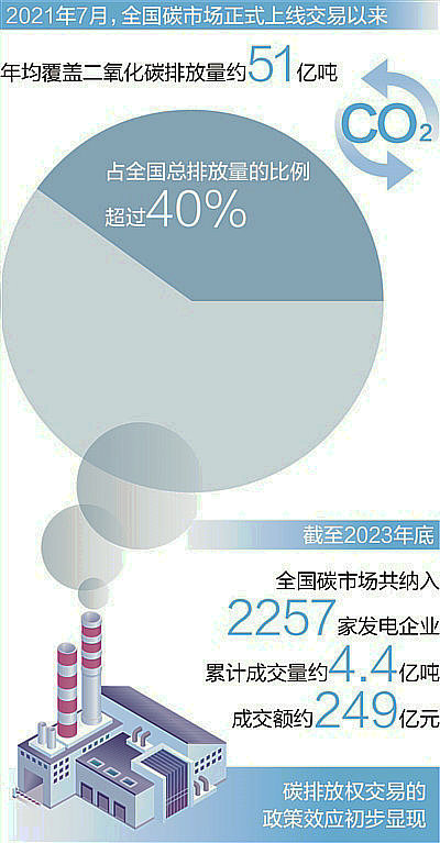 2021年7月全國碳市場正式上線交易以來,運行整體平穩(wěn),年均覆蓋二氧化碳排放量約51億噸,占全國總排放量的比例超過40%。截至2023年底,全國碳市場共納入2257家發(fā)電企業(yè),累計成交量約4.4億噸,成交額約249億元,碳排放權(quán)交易的政策效應(yīng)初步顯現(xiàn)。