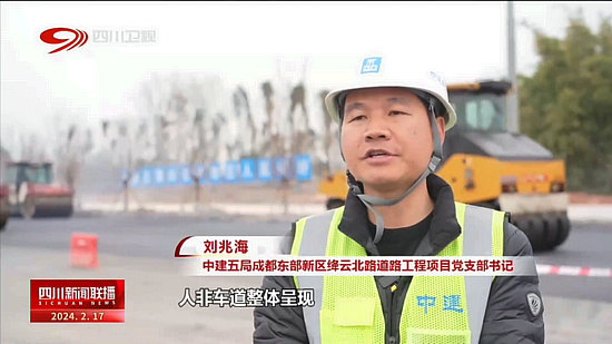 中建五局成都東部新區(qū)絳云北路道路工程項目黨支部書記 劉兆海:人非車道整體呈現(xiàn),二標(biāo)段絳溪五線至絳云大道半幅水穩(wěn)層已完成,橋梁車行道箱梁架設(shè)完成,電力排管完成80%。