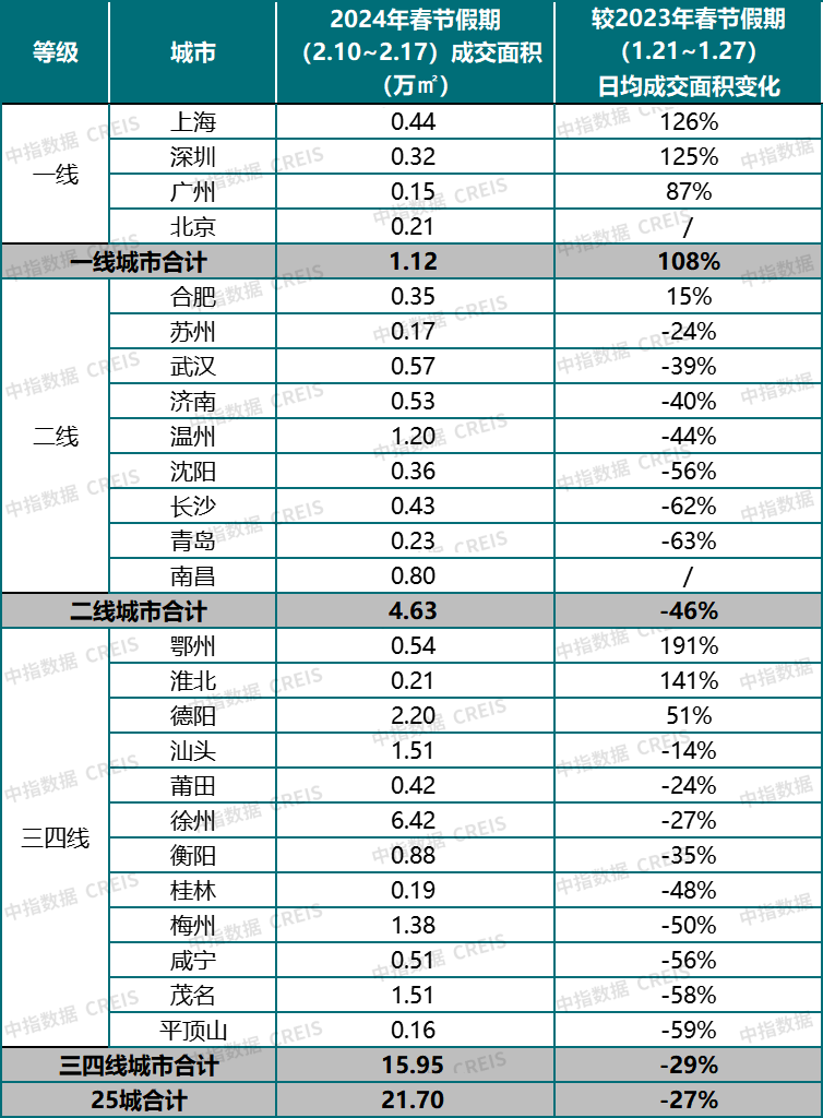 中指研究院的監(jiān)測數(shù)據(jù)顯示,2024年春節(jié)假期期間(2.10~2.17),25個代表城市新房日均成交面積較上年春節(jié)假期(2023.1.21~2023.1.27)下降約27%。