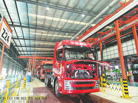 在中國(guó)重汽集團(tuán)綿陽(yáng)基地車間里,裝配線上正在進(jìn)行駕駛室落裝程序