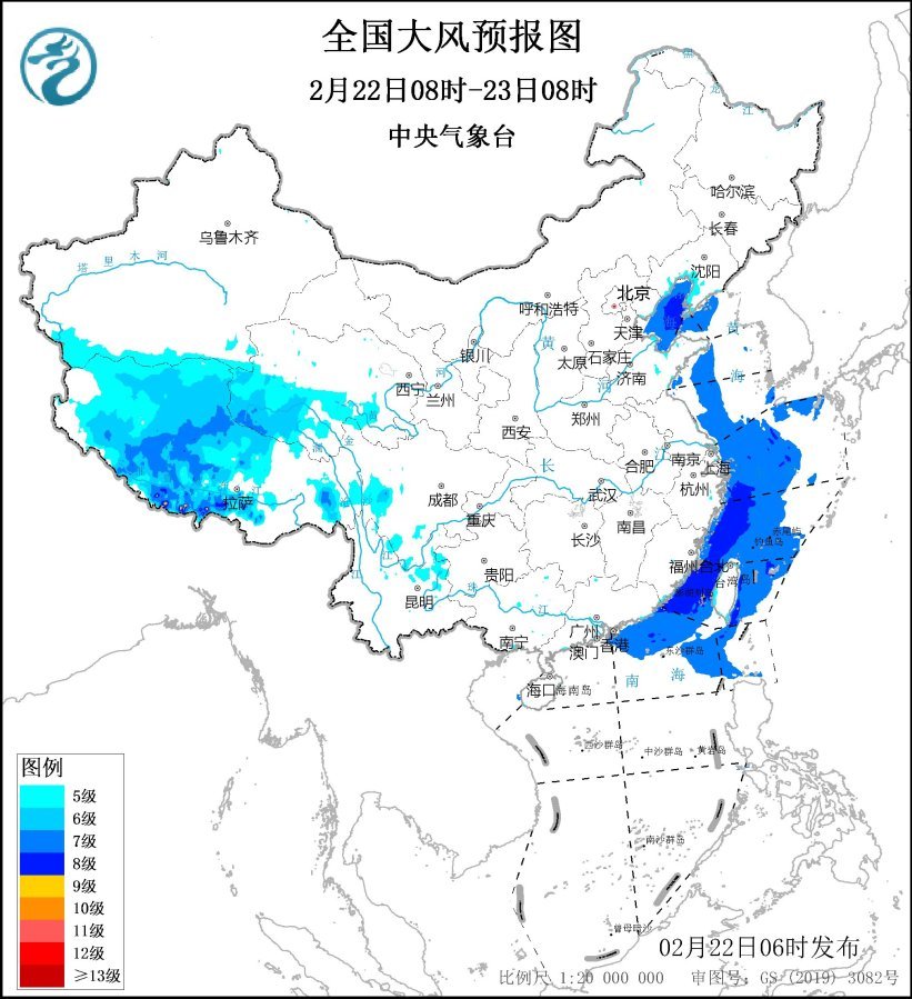 預(yù)計(jì),2月22日08時(shí)至23日08時(shí),西藏中西部、青海西南部、遼東半島、云南東部等地的部分地區(qū)有5~6級大風(fēng),陣風(fēng)7~8級;渤海、渤海海峽、黃海西部海域、東海西部海域、臺灣海峽、臺灣以東洋面、南海東北部將有7-8級、陣風(fēng)9級的偏北到東北風(fēng)。