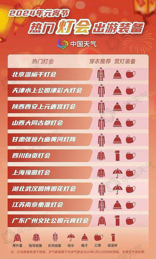 不過花燈雖美,觀賞時也要做好保暖和健康防護(hù)。元宵節(jié)當(dāng)天,北方大部地區(qū)天氣利于賞燈,但最低氣溫普遍在冰點以下,山西大同甚至低于零下10℃,寒意十足,有外出賞燈計劃的朋友建議穿上長款羽絨服保暖;南方體感普遍濕冷,上海、湖北武漢、江蘇南京、四川自貢的朋友也需羽絨服護(hù)體,上海、武漢、南京還將伴有降水,容易出現(xiàn)道路積雪或結(jié)冰現(xiàn)象,待在家中“云賞燈”也是不錯的選擇;廣東廣州體感會舒適很多,全天氣溫都在10℃以上,外出賞燈的朋友穿件厚外套足矣。此外,元宵節(jié)賞燈時人員密集,容易形成交叉感染,建議各位佩戴好口罩,避免扎堆,做好健康防護(hù)和安全工作。