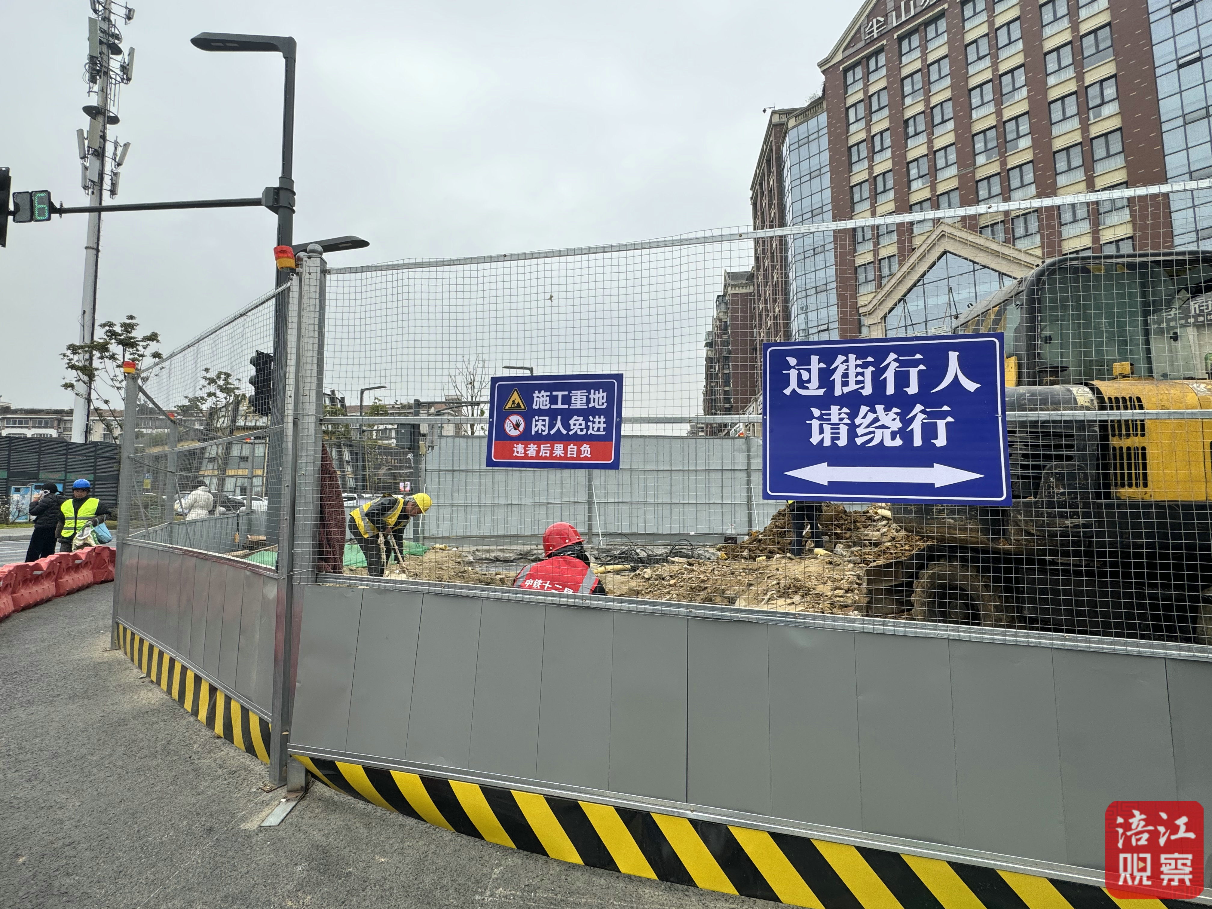 記者在施工現(xiàn)場看到,圍擋里天橋的四個橋樁基礎(chǔ)施工正抓緊實施,旋挖機正在挖橋梁樁孔,工人們干勁十足。
