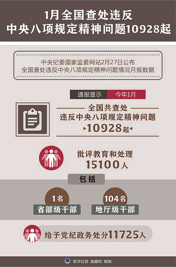 新華社北京2月27日電(記者孫少龍)中央紀委國家監(jiān)委網(wǎng)站27日公布全國查處違反中央八項規(guī)定精神問題情況月報數(shù)據(jù)。通報顯示,今年1月,全國共查處違反中央八項規(guī)定精神問題10928起,批評教育和處理15100人(包括1名省部級干部、104名地廳級干部),給予黨紀政務處分11725人。