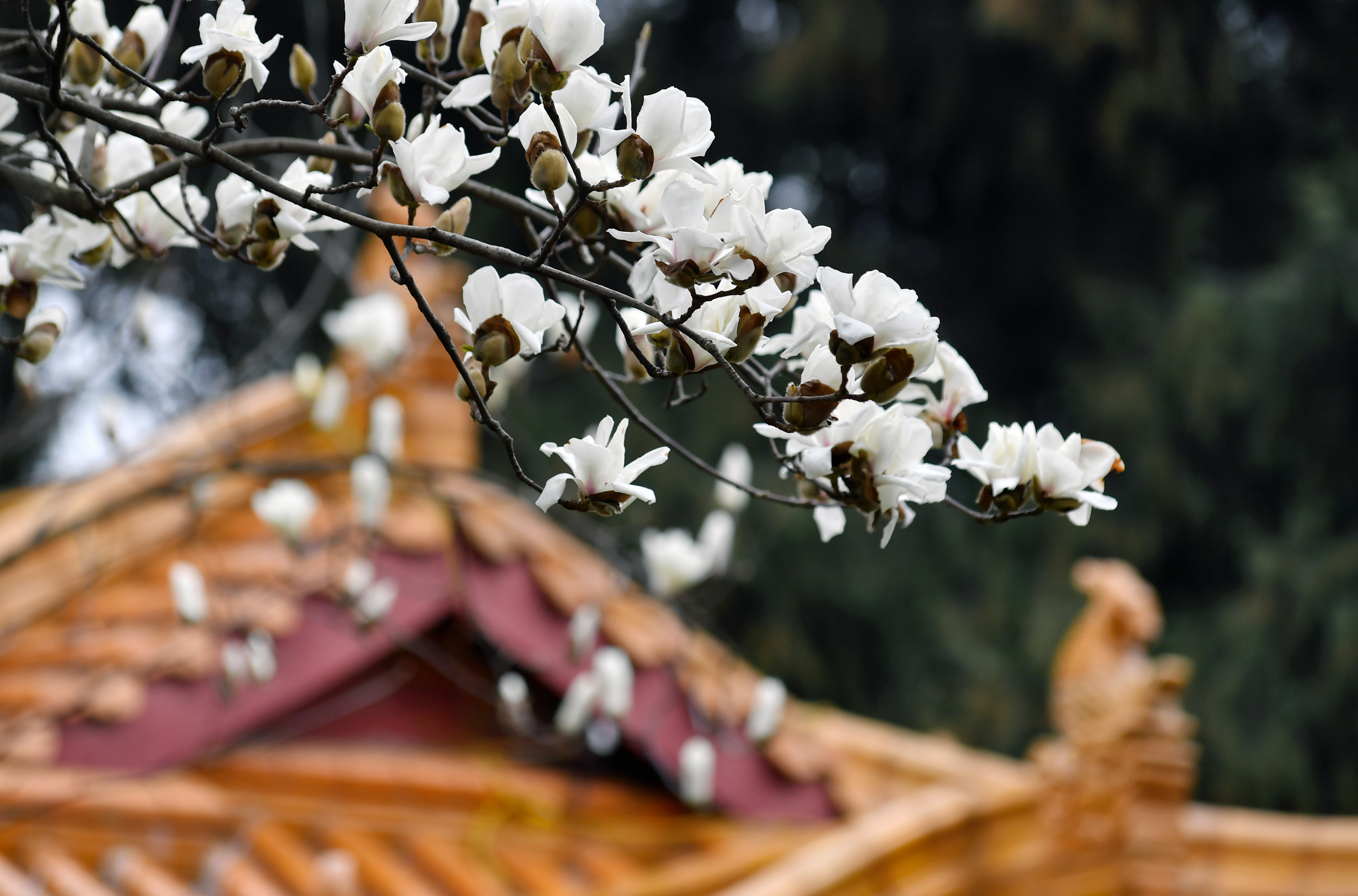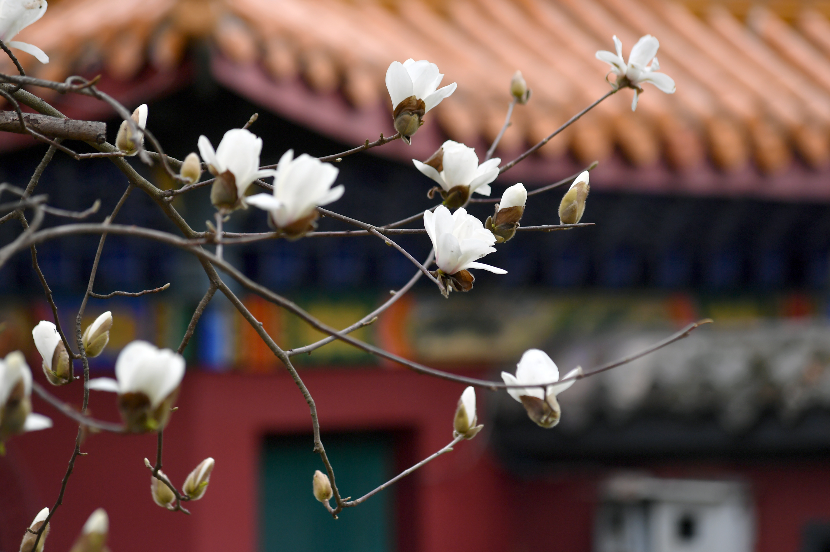 在富樂(lè)山,一朵朵潔白碩大的玉蘭花與古香古色的紅墻黃瓦、飛檐脊獸相互映襯,呈現(xiàn)出一幅韻味十足的詩(shī)意美景圖,吸引了許多市民觀賞和拍照。