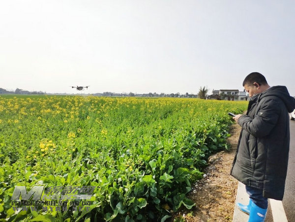 調(diào)配農(nóng)藥、調(diào)試無人機、預(yù)設(shè)播灑區(qū)域……在園區(qū)天竺村的麥田、油菜地里,伴隨著陣陣轟鳴聲,輕巧的農(nóng)業(yè)無人機滿載著農(nóng)藥從地頭起飛,距作物兩米的距離飛越蔥綠的麥苗,有條不紊地留下細密的水汽,均勻灑下殺蟲劑。