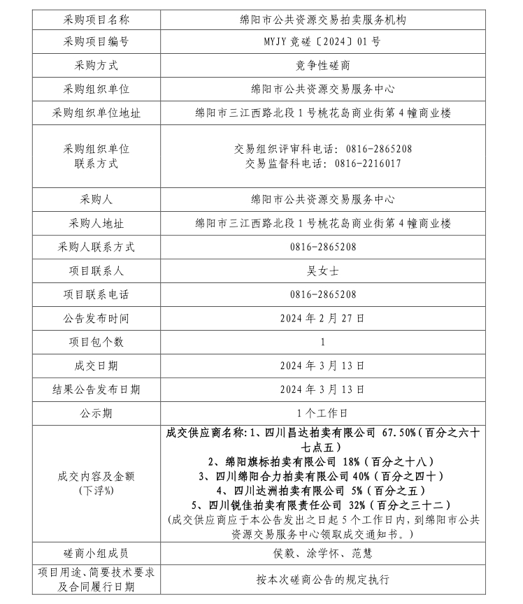 關于“綿陽市公共資源交易拍賣服務機構”項目采購結果的公告
