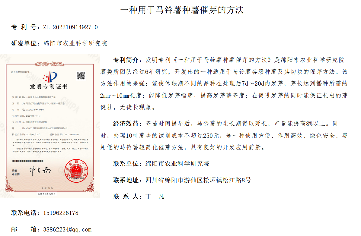根據(jù)《綿陽市農(nóng)業(yè)科學(xué)研究院科技成果轉(zhuǎn)移轉(zhuǎn)化管理辦法》有關(guān)規(guī)定,現(xiàn)對本單位自主研發(fā)的發(fā)明專利“ZL202210914927.0一種用于馬鈴薯種薯催芽的方法”進(jìn)行專利權(quán)受讓方征集,希望有意向的企業(yè)來人、來函咨詢或面洽。