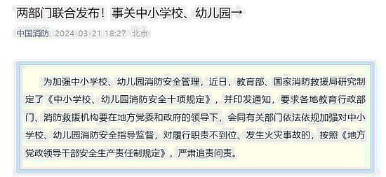 為加強(qiáng)中小學(xué)校、幼兒園消防安全管理,近日,教育部、國(guó)家消防救援局研究制定了《中小學(xué)校、幼兒園消防安全十項(xiàng)規(guī)定》,并印發(fā)通知,要求各地教育行政部門(mén)、消防救援機(jī)構(gòu)要在地方黨委和政府的領(lǐng)導(dǎo)下,會(huì)同有關(guān)部門(mén)依法依規(guī)加強(qiáng)對(duì)中小學(xué)校、幼兒園消防安全指導(dǎo)監(jiān)督,對(duì)履行職責(zé)不到位、發(fā)生火災(zāi)事故的,按照《地方黨政領(lǐng)導(dǎo)干部安全生產(chǎn)責(zé)任制規(guī)定》,嚴(yán)肅追責(zé)問(wèn)責(zé)。
