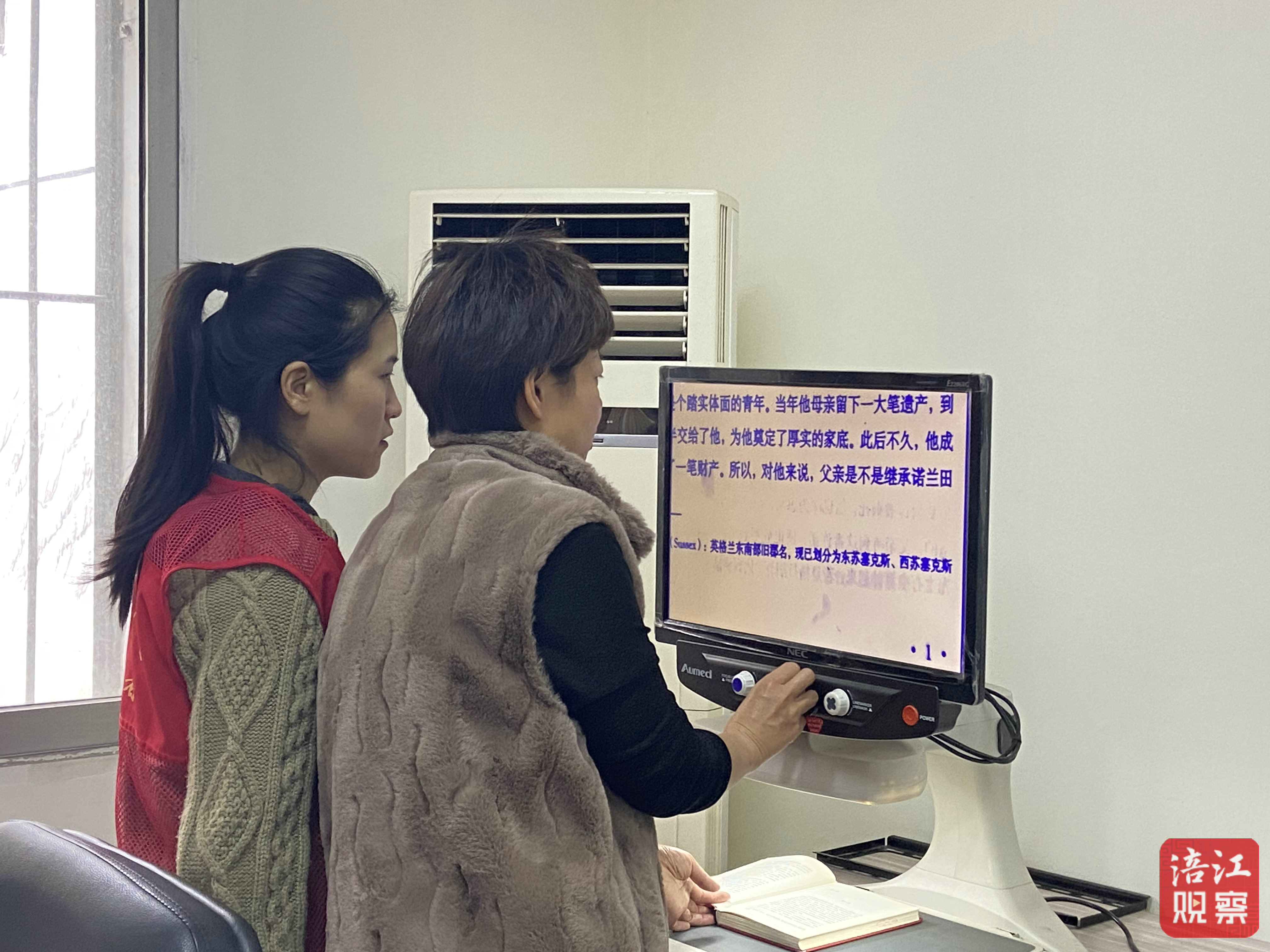 順著李春蘭指的方向,視障讀者姚瑜正在市圖書館工作人員的幫助下,往右扭動(dòng)助視儀的旋鈕,將《理智與情感》一書的文字放大。“之前看書都是自帶放大鏡,有了這款助視儀就方便多了,翻頁也很簡單,對(duì)我們低視力人士很友好。”姚瑜邊操作邊告訴記者。