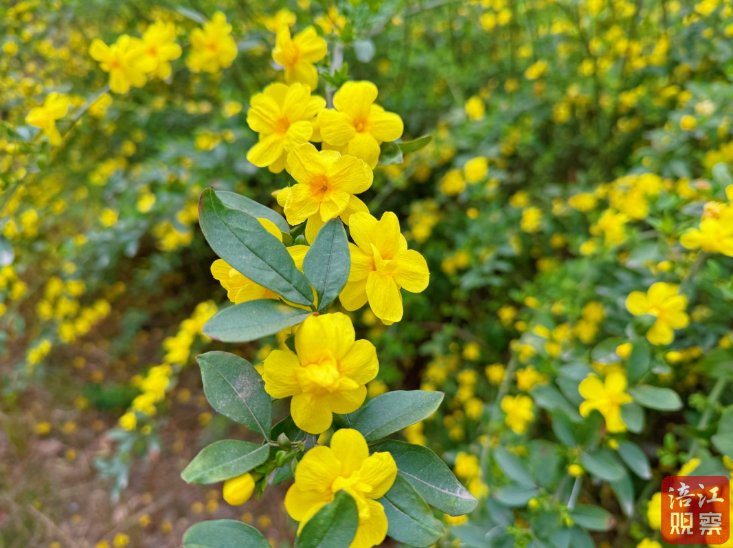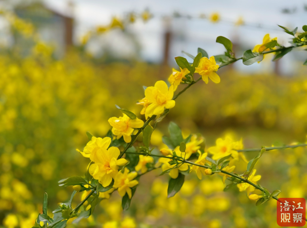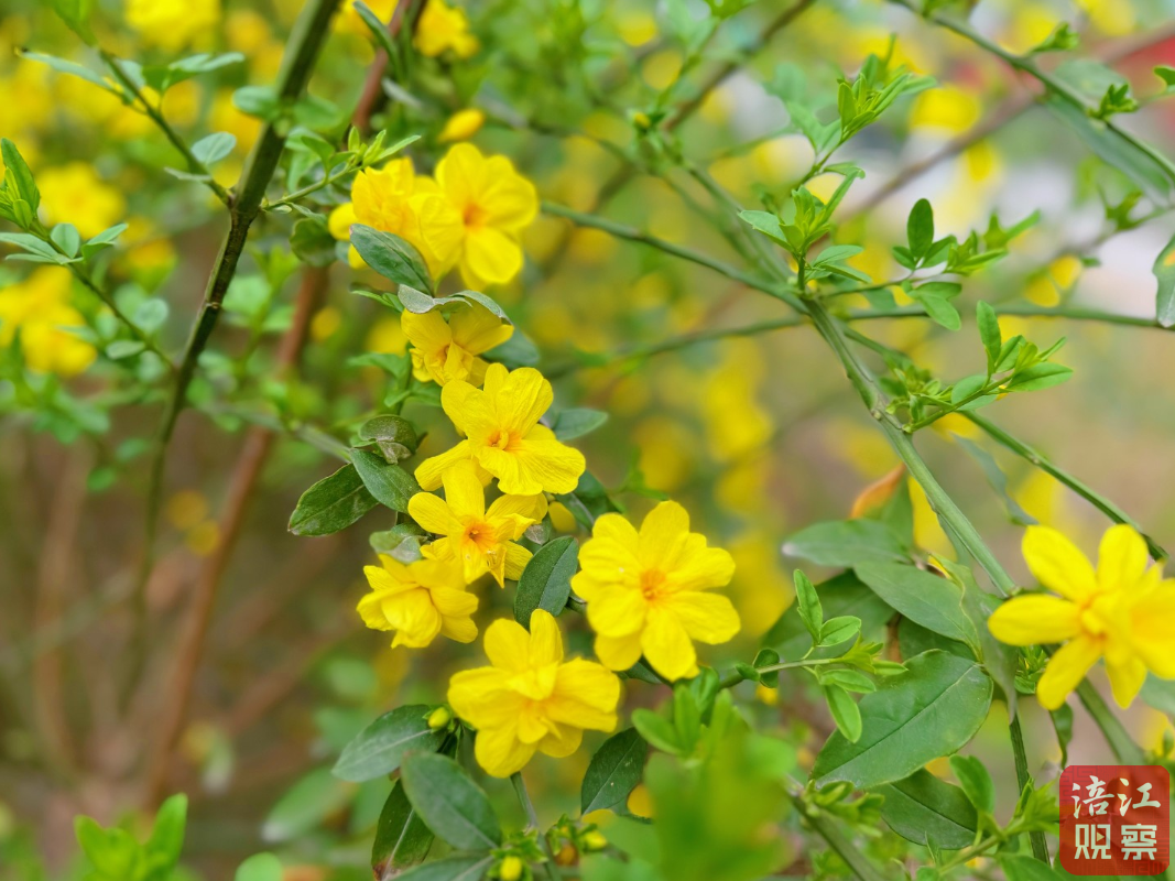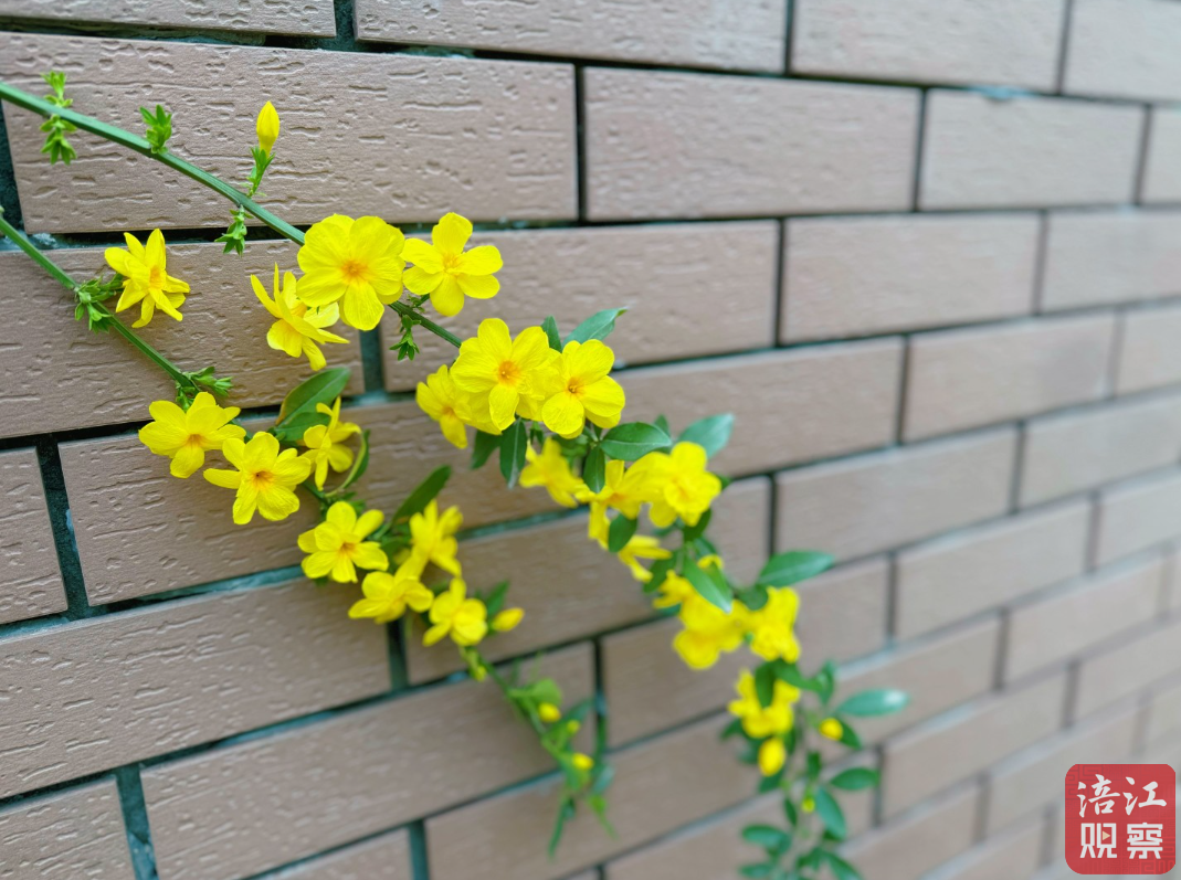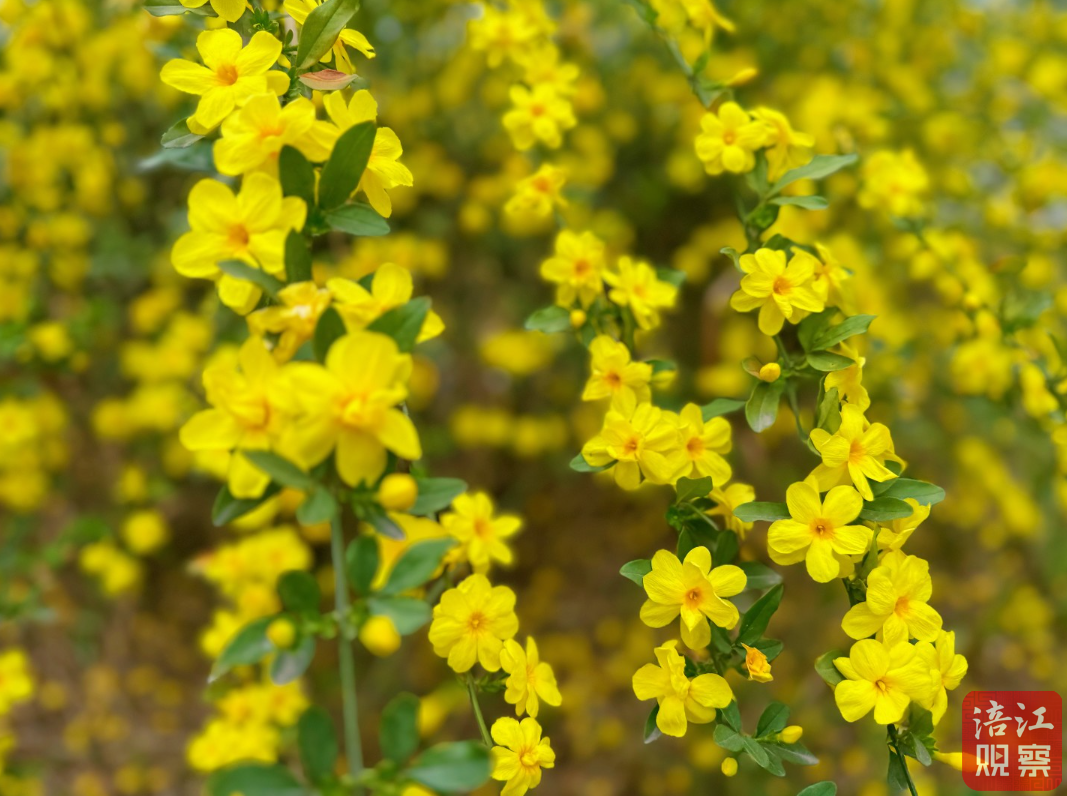在綿陽(yáng)鹽亭縣,迎春花爭(zhēng)相開(kāi)放,點(diǎn)點(diǎn)金黃,十分奪目。陣陣微風(fēng)襲來(lái),一朵朵金黃的迎春花隨著披垂的細(xì)長(zhǎng)枝條飛舞,不時(shí)還散發(fā)出悠悠淡香。