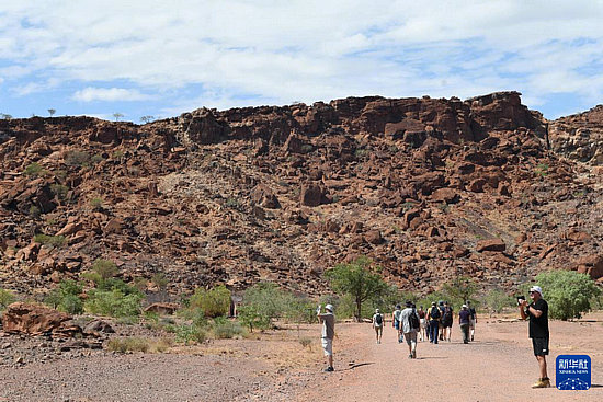 3月26日,在納米比亞庫(kù)內(nèi)內(nèi)省,游客參觀頹廢方丹巖畫遺址。