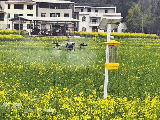 該鎮(zhèn)在園區(qū)全面推行“有機(jī)肥+測土配方肥”,開展統(tǒng)防統(tǒng)治,采取釋放赤眼蜂、設(shè)置誘捕器和太陽能殺蟲燈等技術(shù)措施,實現(xiàn)全域綠色防控,推動農(nóng)藥、化肥減量增效。